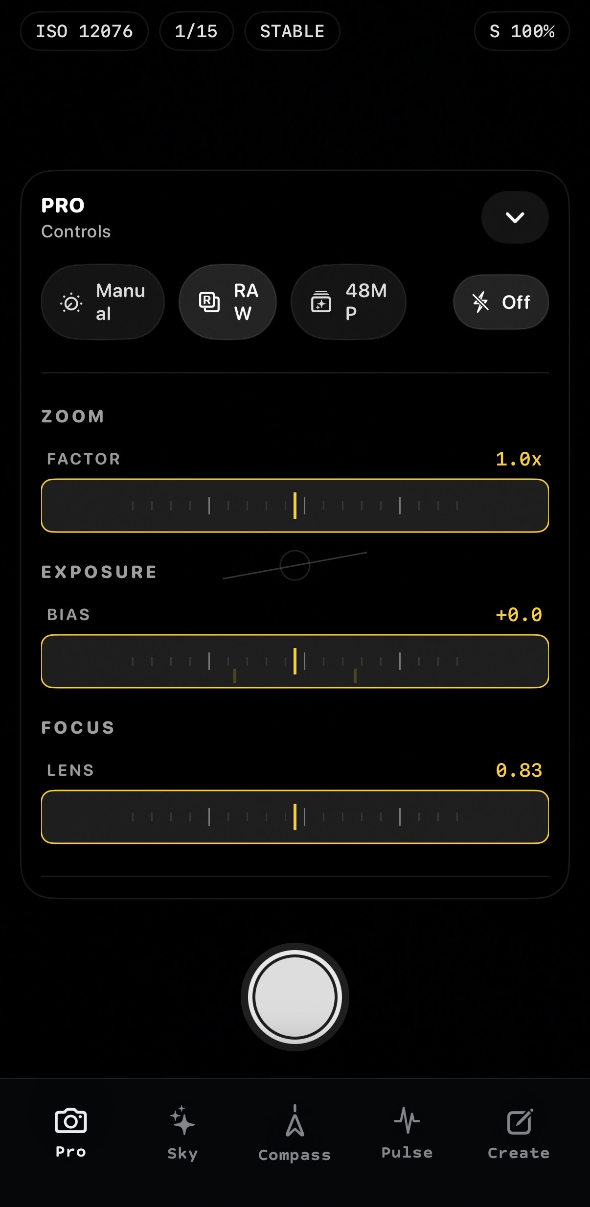 Manual + RAW capture controls built for low-light and night-sky work.
