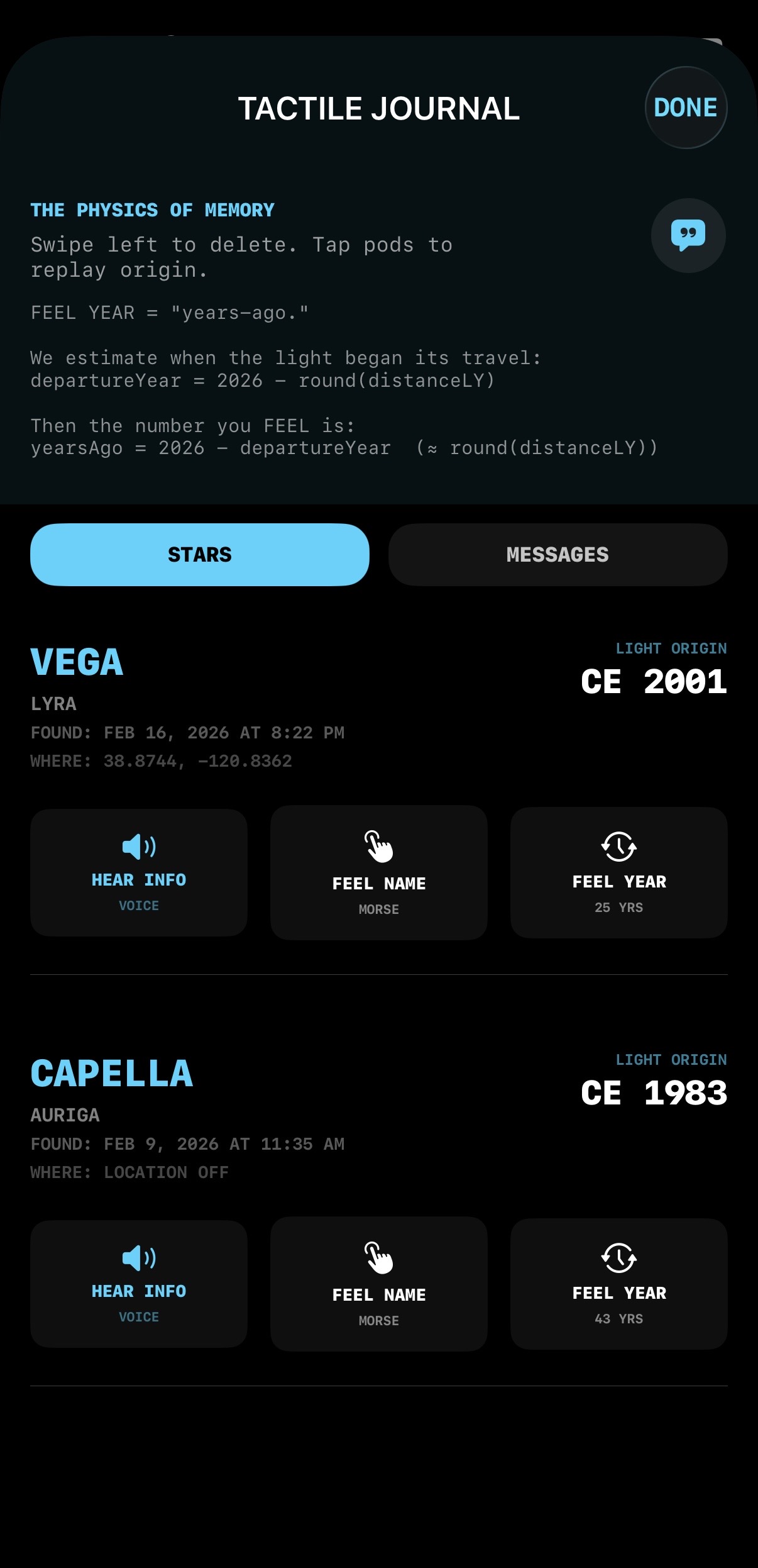 Tactile journal — feel light travel through time.