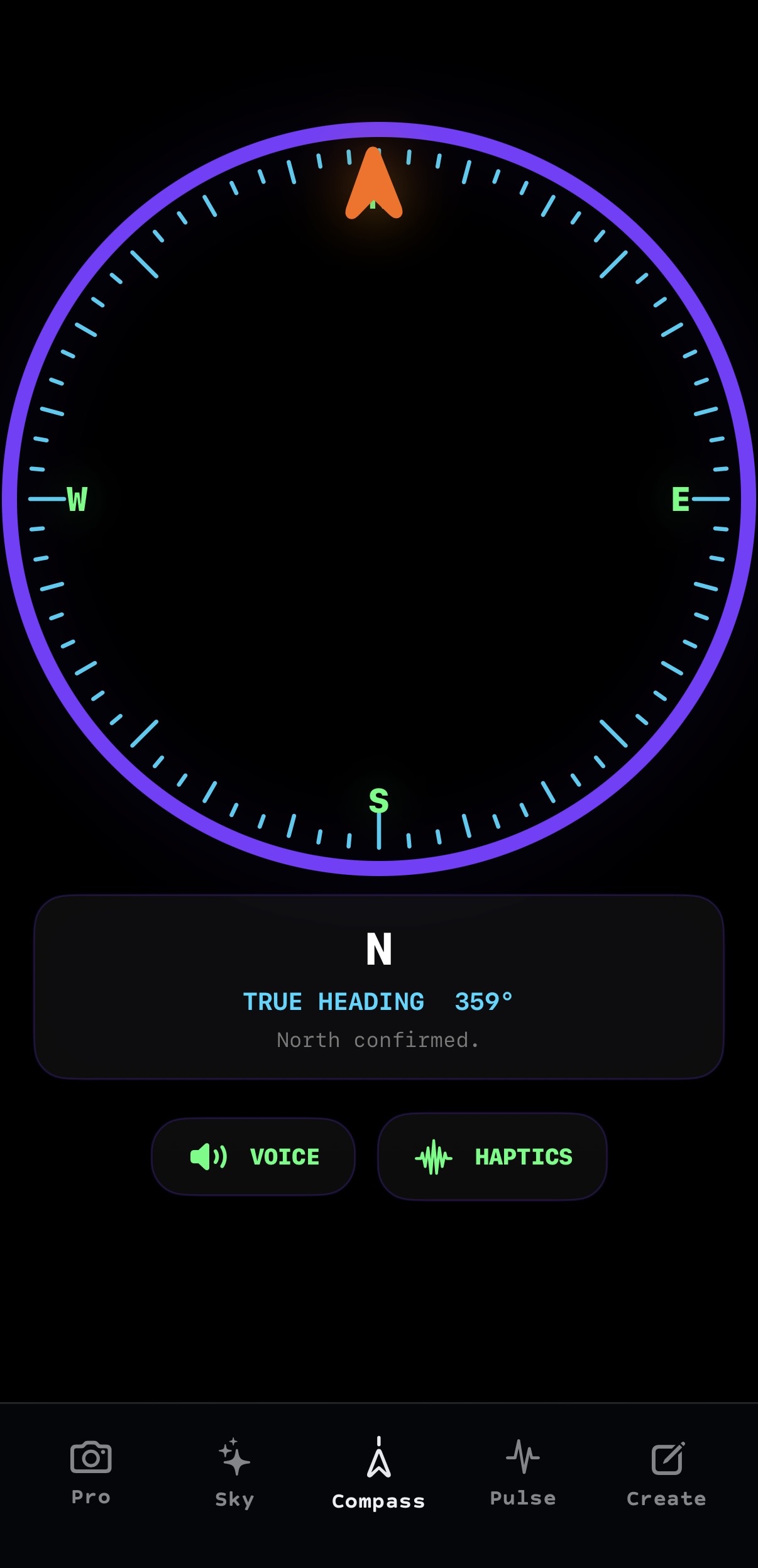 True heading with voice and haptic confirmation.